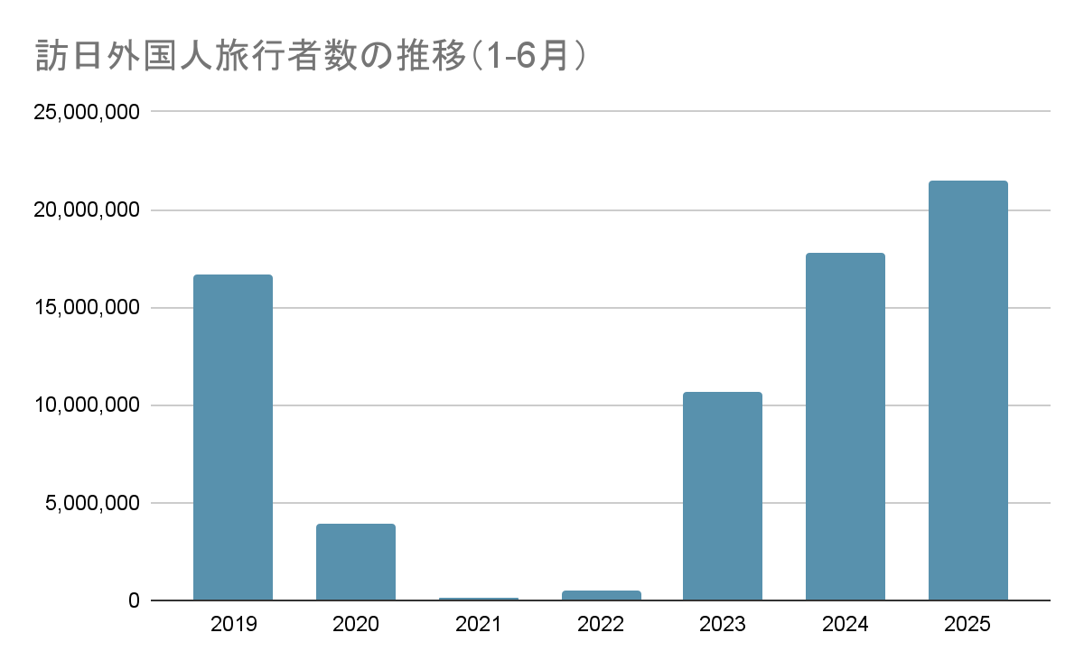 2025年は、過去のデータや予測を上回るペースで訪日外国人旅行者数が増加しています。JNTO(日本政府観光局)が発表している2025年1月〜6月の統計では、累計で2,151万8,100人となり、過去最速のペースで2,000万人を突破しました。円安も引き続き、増加を後押ししています。