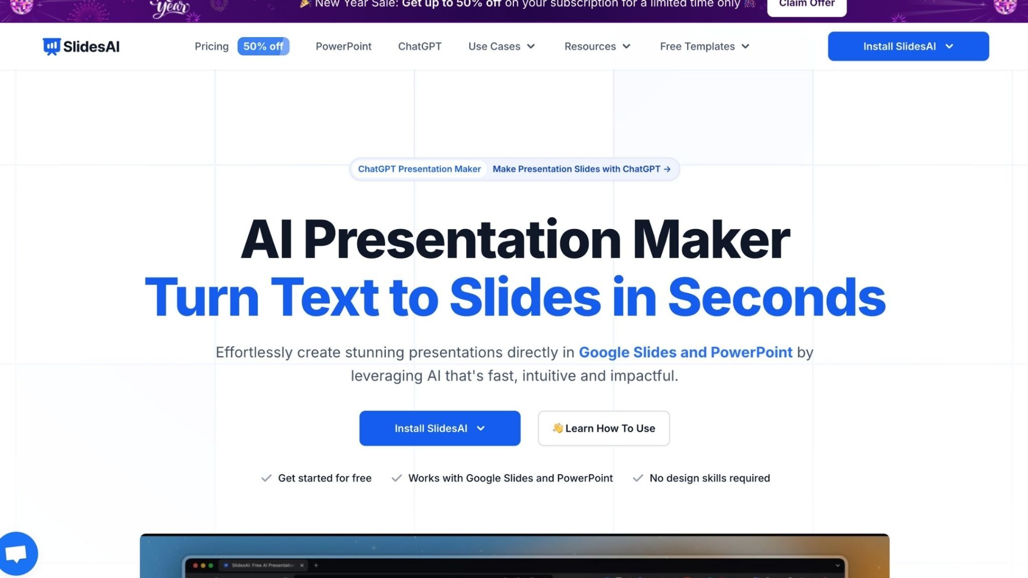 SlidesAIは入力した文章や箇条書きをもとに、短時間でスライドを自動生成する軽量型AIツールです。Google Slidesと連携して動作する点が特徴で、「文章をそのままスライドにしたい」「とにかく早く形にしたい」というニーズに応えます。アメリカでは、社内説明用資料や簡易プレゼン、アイデア共有用スライドの作成に使われるケースが多く見られます。