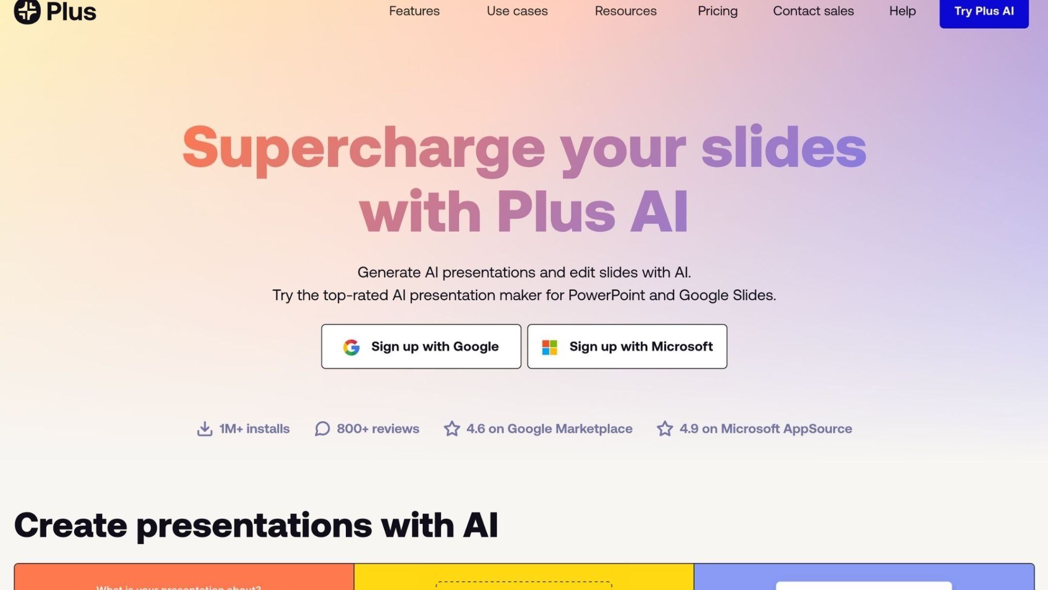 Plus AIは、PowerPointやGoogle Slidesと連携して使う拡張型のAIスライド作成ツールとして、アメリカのビジネスユーザーから評価されています。Gammaのようにゼロからスライドを生成するというよりも、既存のアウトラインやドラフト資料をAIで磨き上げる用途に強みがあります。文章からスライド化するだけでなく、構成の再整理、要点の簡潔化、スライド枚数の最適化などをAIが支援します。