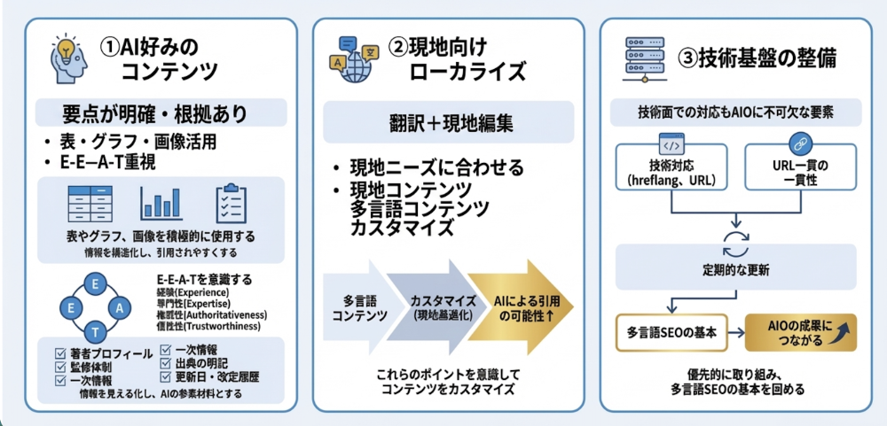AIOのポイントは、SEO対策も行いつつ、AIからの信頼性を獲得するためのコンテンツを設計することです。①AIに好まれるコンテンツ作成、②現地意図に合わせたローカライズ、③多言語サイト設計の整備の3点をセットで進めることで、海外マーケティングの成功に近づきます。まずは、自社のコンテンツをAIに評価されやすい形に整えるところから始めてみてください。