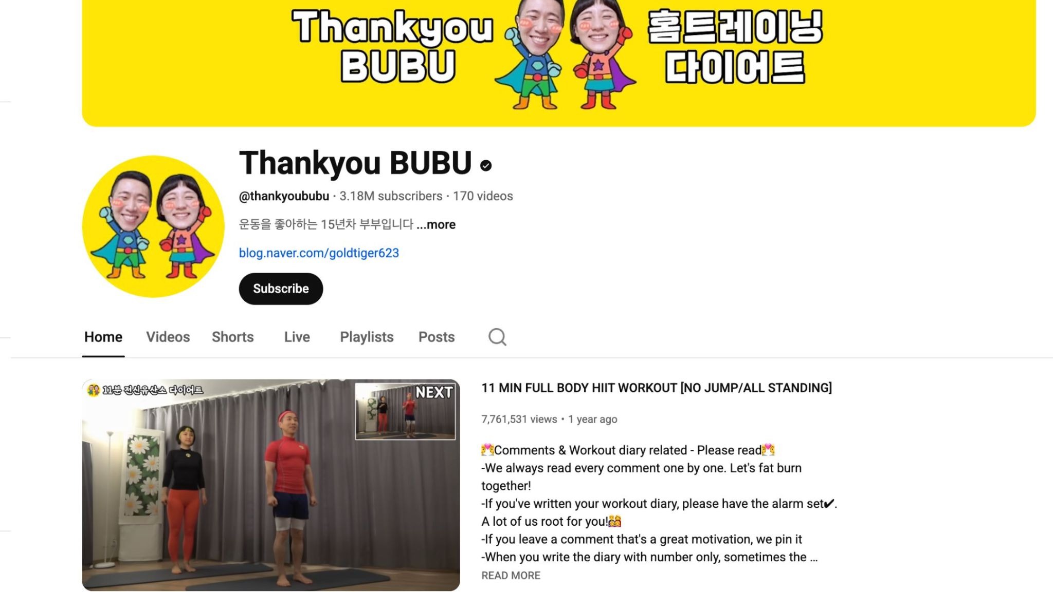 「땅끄부부(Thankyou BUBU)」は、韓国国内のみならず海外でも圧倒的な支持を集めるホームトレーニング系YouTubeチャンネルであり、その登録者数は318万人を超えています。夫婦が二人三脚で運営している点がユニークで、家庭的な雰囲気とプロフェッショナルな内容を兼ね備えた動画は、多くの視聴者にとって“生活の一部”として定着。