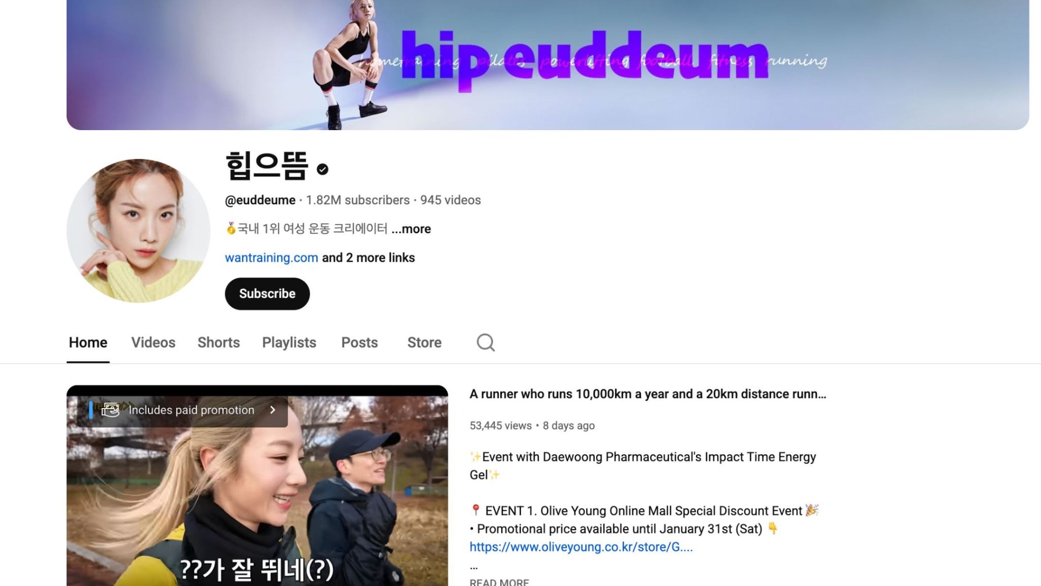 「힙으뜸(HipEutteum)」は、韓国のフィットネスYouTuberの中でも最も知名度の高い存在の一人であり、特に女性から絶大な支持を集めています。彼女のチャンネルは登録者数が180万人を超え、単なる運動動画を配信するにとどまらず、韓国国内のボディメイク文化そのものをリードする役割を果たしています。名前の「힙으뜸」は直訳すると「ヒップ(お尻)でトップに」という意味を含み、その通りヒップアップ運動をきっかけに人気が爆発しました。