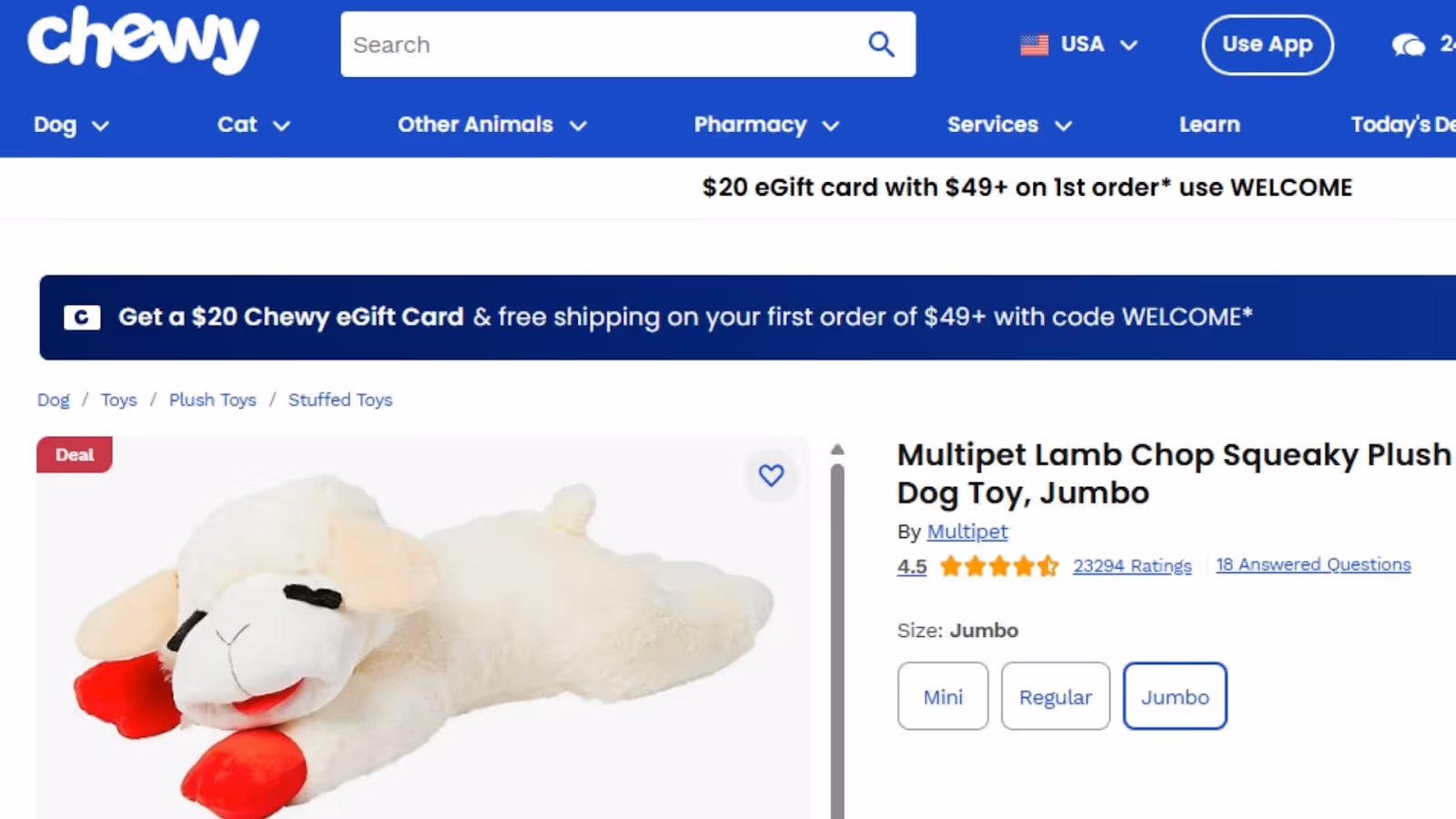 出典:chewyに記載されているMultipet Lamb Chop Squeaky Plush Dog Toy