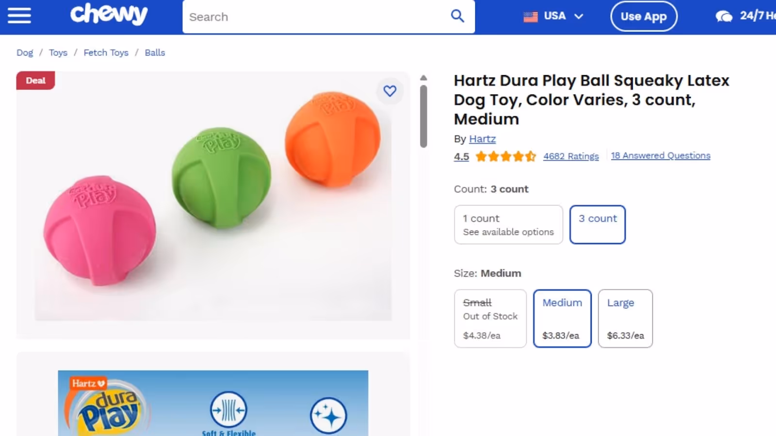 出典:chewyに記載されているartz Dura Play Ball Squeaky Latex Dog Toy