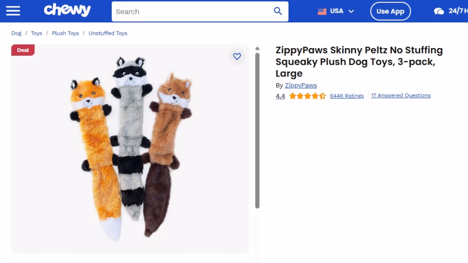 出典:chewyに記載されているZippyPaws Skinny Peltz No Stuffing Squeaky Plush Dog Toys