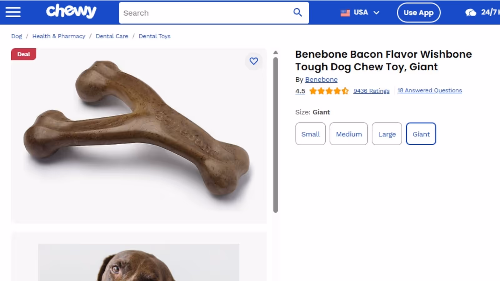 出典:chewyに記載されているBenebone Bacon Flavor Wishbone Tough Dog Chew Toy