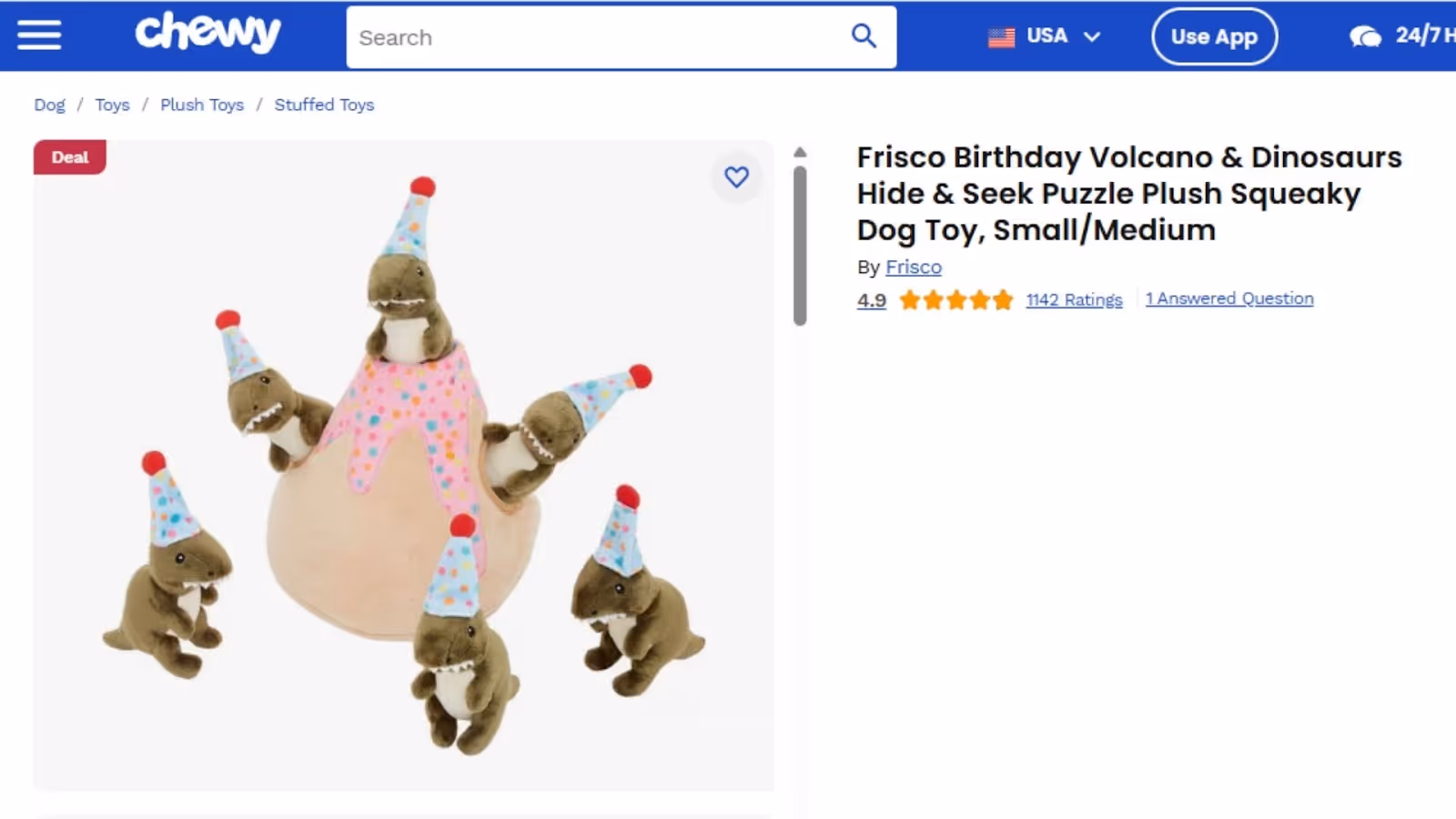 出典:chewyに記載されているFrisco Birthday Volcano & Dinosaurs Hide & Seek Puzzle Plush Squeaky Dog Toy