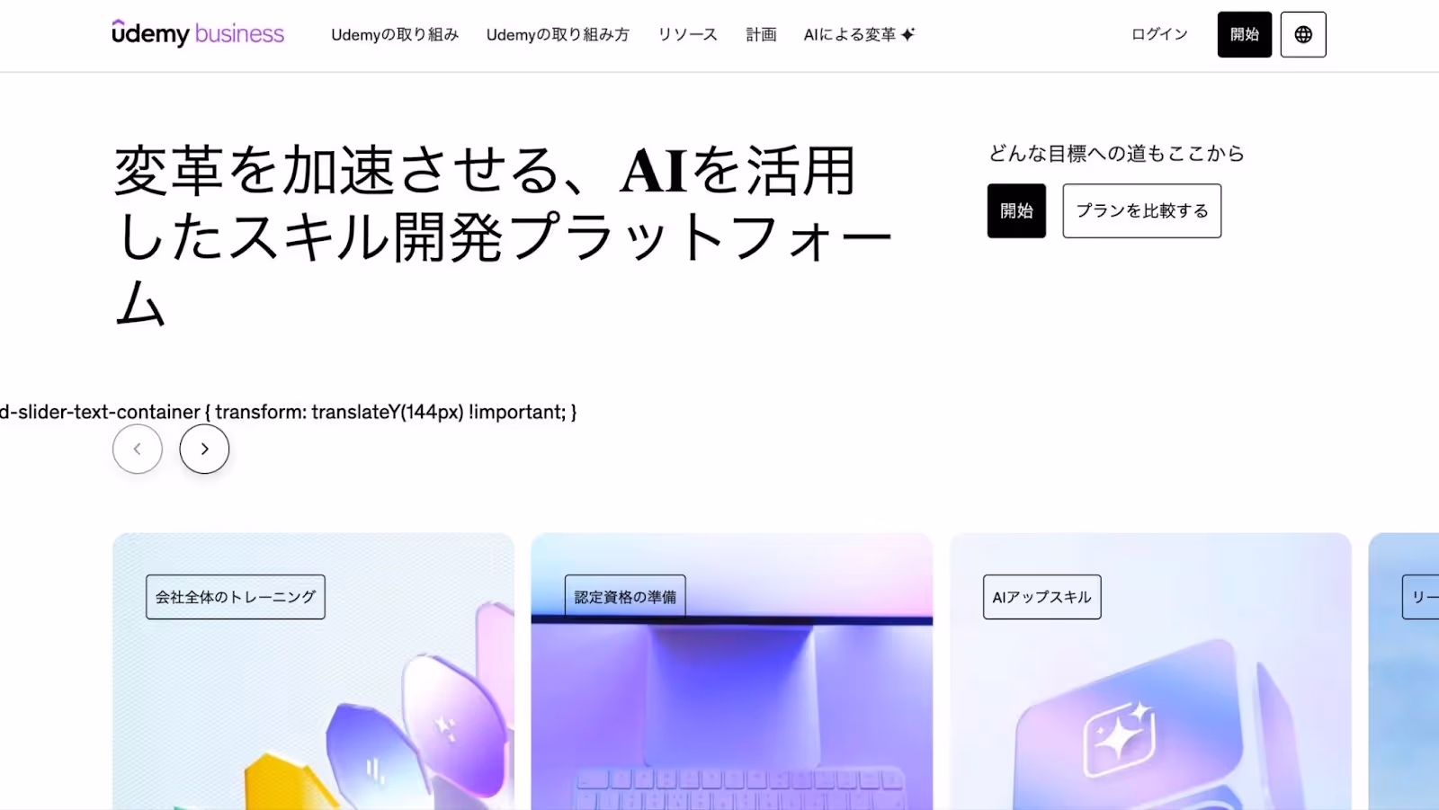 Udemy for Businessは、世界中の専門家が提供する20,000本以上のオンラインコースを企業向けに提供するeラーニングプラットフォームです。ビジネス研修においては、リーダーシップ、プロジェクトマネジメント、マーケティング、データ分析など幅広い分野を網羅しており、中小企業から大企業まで規模を問わず導入しやすいのが特徴です。