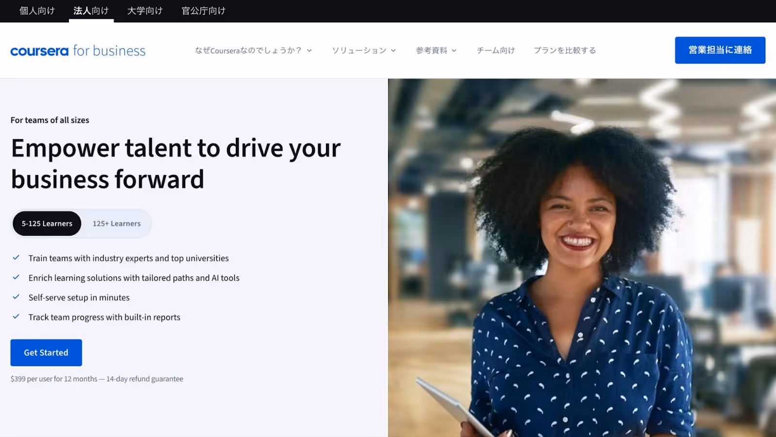 Coursera for Businessは、世界中の有名大学や大手企業と提携し、質の高いオンラインコースを提供する法人向けeラーニングサービスです。ビジネス研修の分野では、リーダーシップ開発、戦略的思考、データサイエンス、マーケティング戦略など、実務直結型のコースが豊富にそろっています。受講者は動画講義だけでなく、ケーススタディやインタラクティブ課題を通じて学びを深めることが可能です。