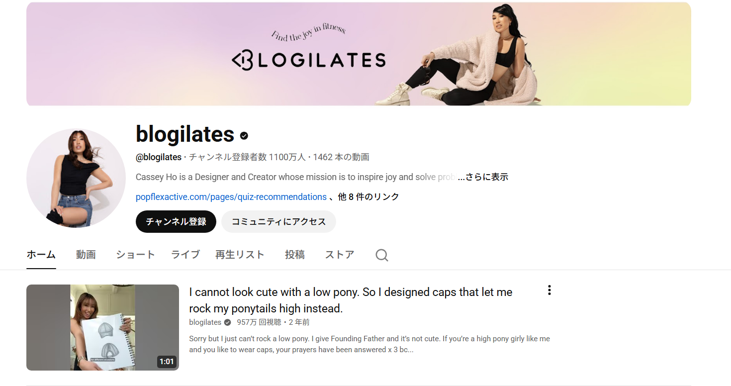 キャシー・ホー氏が手掛けるBlogilates。彼女はアメリカのピラティスインストラクター兼デザイナーとして活動しており、Time誌の「最も影響力のあるネットインフルエンサー」に選ばれたことも。YouTubeではフィットネス動画や、自身のブランド「POPFLEX」のファッション商品紹介動画、他社商品のレビュー動画などがアップされています。ファッションでは機能性とスタイルを重視しており、独特の視点が注目されています。