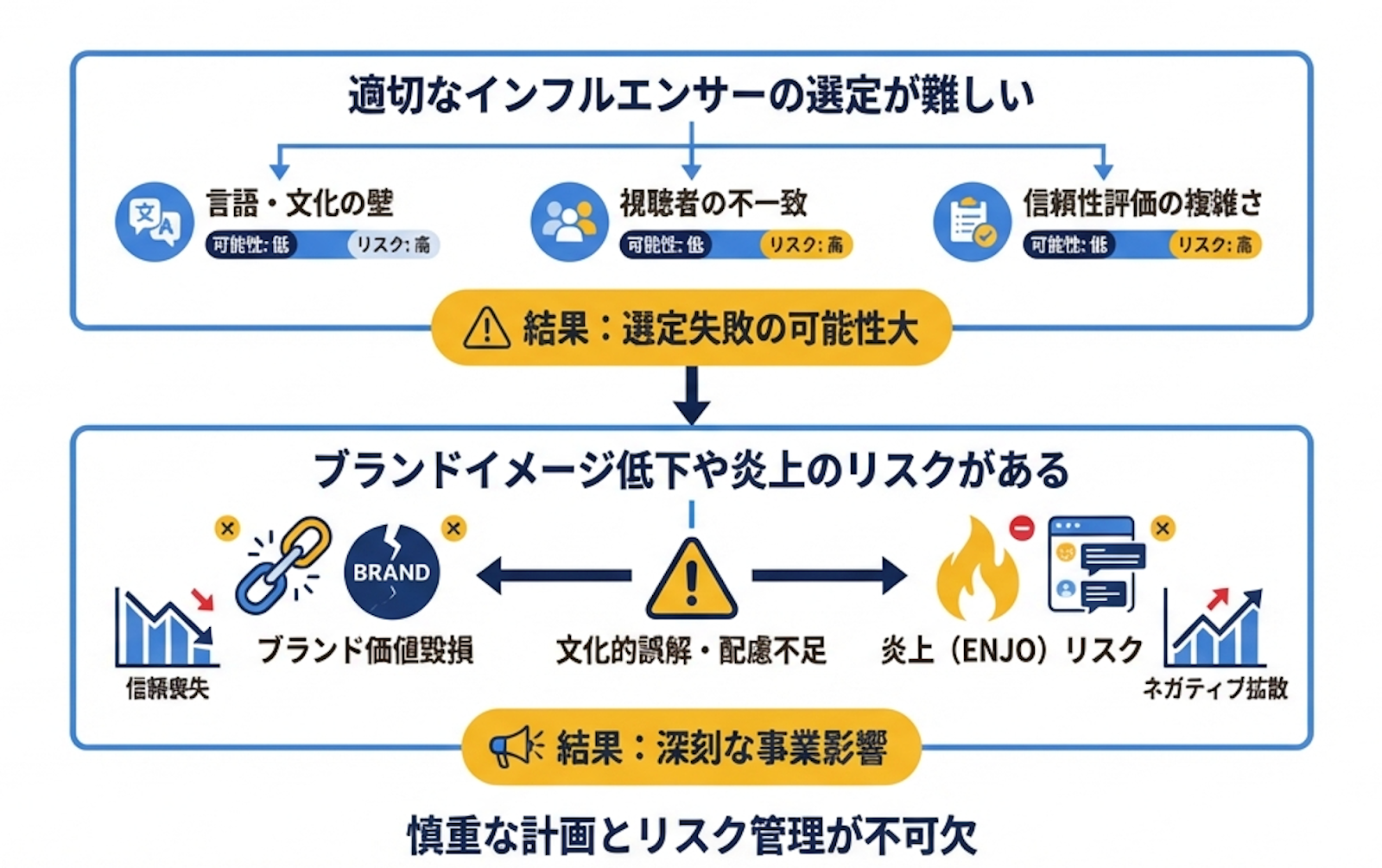インフルエンサーマーケティングには、起用したインフルエンサーの過去の発言や行動が問題視され、炎上するリスクがある点にも留意が必要です。