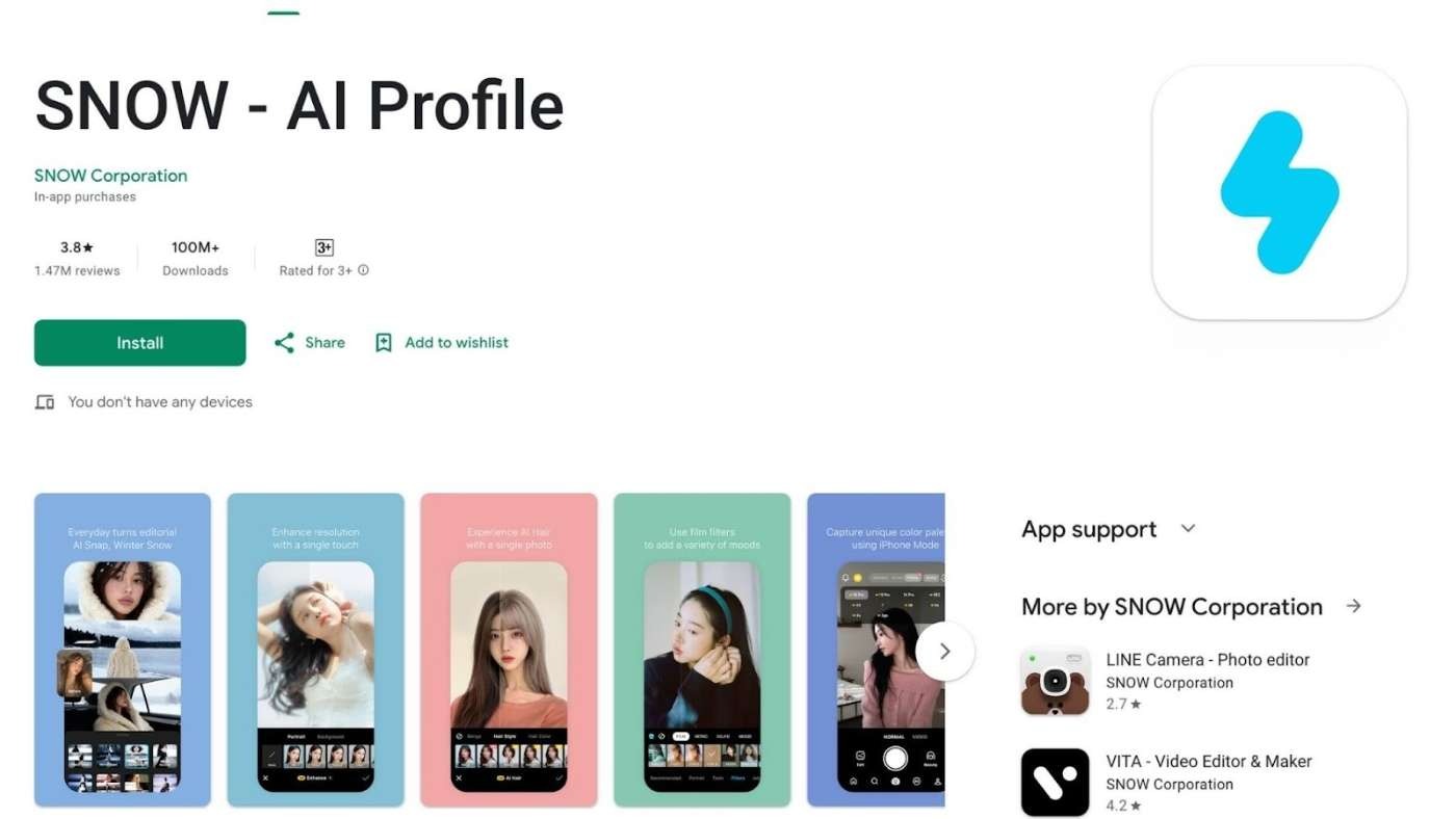 SNOW Corporationが開発した写真補正アプリで、不自然さを排除した「素肌感を活かした美肌補正」に特化しています。Google Playでの累計ダウンロード数は1,000万件を超えており、ユーザーの約8割が女性です。ナチュラル志向の美容ブランドや、K-ビューティーに関連した製品のプロモーションとの相性が高く、インフルエンサーマーケティングの場としても機能します。