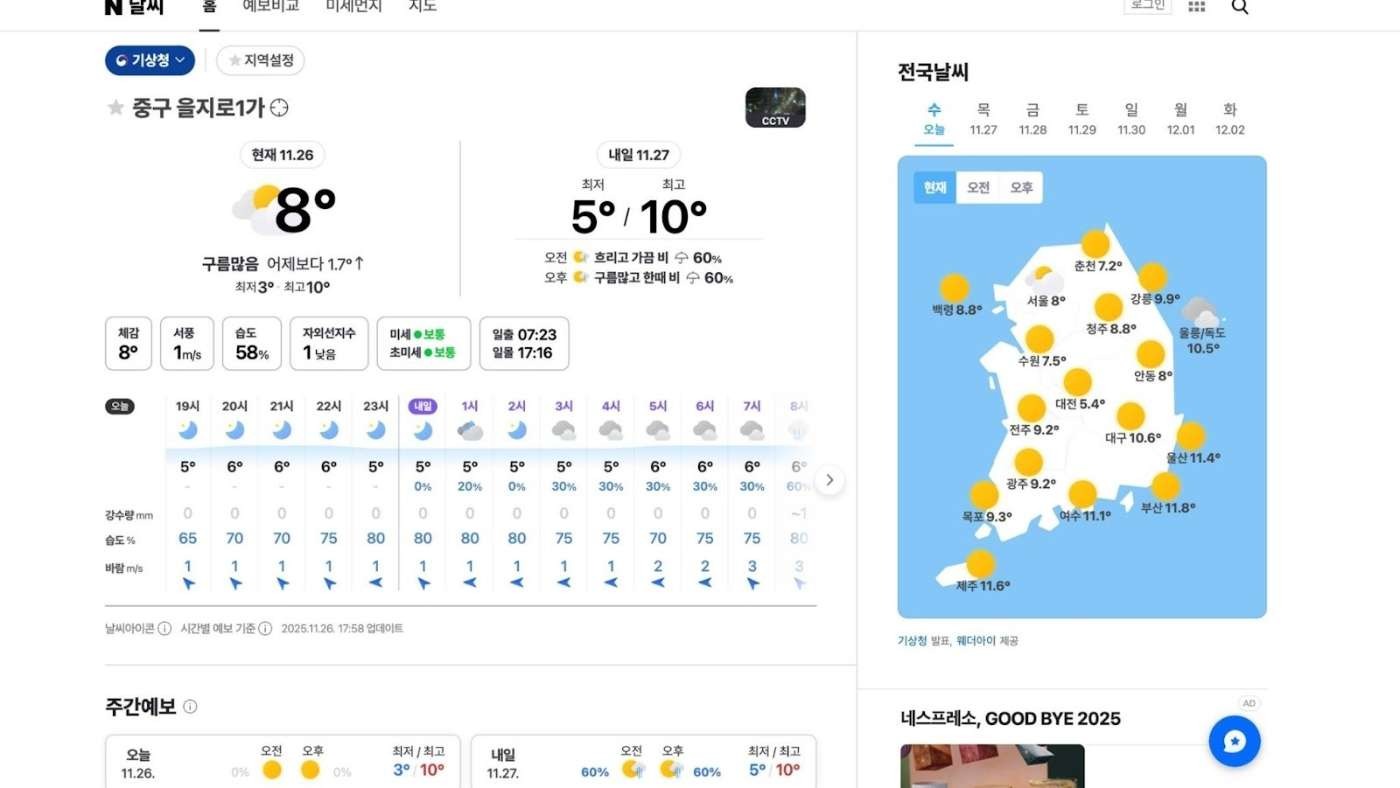 NAVER Weather はNAVERポータル内の天気情報に直結しており、「とりあえずNAVERで調べる」という韓国人の習慣に乗った形で日常的に利用されています。NAVERの広告エコシステムを活用することで、天気情報閲覧時のユーザーへのリーチが可能です。