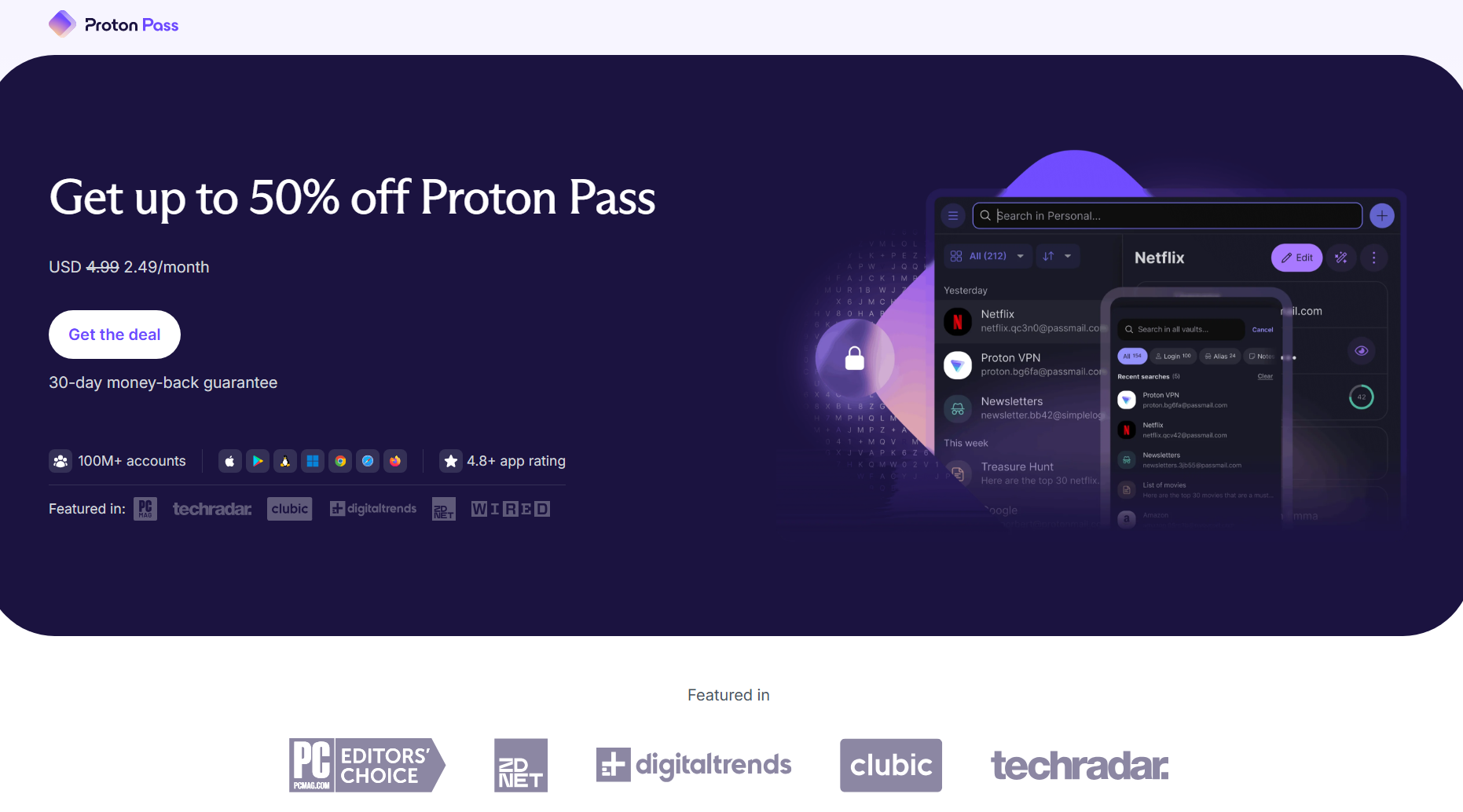 Proton Passは、スイスのProton社が提供するプライバシー重視のパスワード管理ツールで、AES-256暗号化とゼロ知識アーキテクチャにより高い安全性を実現しています。オープンソースで透明性が高く、Windows、macOS、Linux、iOS、Android、主要ブラウザ拡張に対応し、複数デバイス間で安全に同期できます。無料プランでも無制限のパスワード保存、メモやクレジットカード情報の管理が可能で、基本的な機能を十分に利用できます。有料のProton Pass Plusは月額約2.49ドルから利用でき、メールエイリアス生成、ダークウェブ監視、より高度なセキュリティ機能が追加されます。さらにProton Unlimitedなどの上位プランでは、Proton Mail、VPN、クラウドストレージを含む総合的なプライバシー保護環境を構築できる点も大きな魅力です。直感的な操作性で初心者から上級者まで幅広く支持されています。
