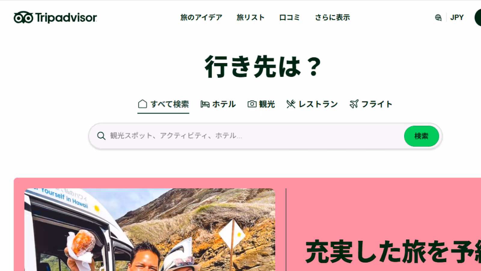 Tripadvisorは、旅行関連に特化した世界最大級の口コミサイトです。ホテル、レストラン、観光スポット、航空会社などのレビューが充実。米国では観光や出張前の情報収集ツールとして定着しており、中〜高所得層や旅行好きのミレニアル世代に特に支持されています。実体験に基づいたレビューや写真が豊富に投稿されており、旅先のリアルな雰囲気を把握しやすい点が特徴。近年は「体験型アクティビティ」の予約にも対応しており、旅行プランニングの総合ハブとしても進化しています。