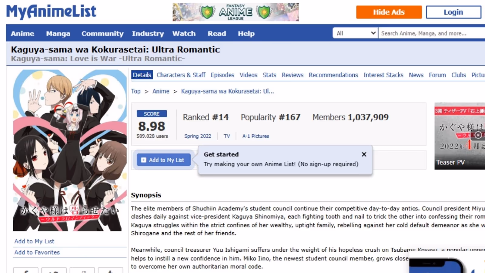 - Kaguya-sama wa Kokurasetai: Ultra Romantic(かぐや様は告らせたい ウルトラロマンティック) ☆8.98
