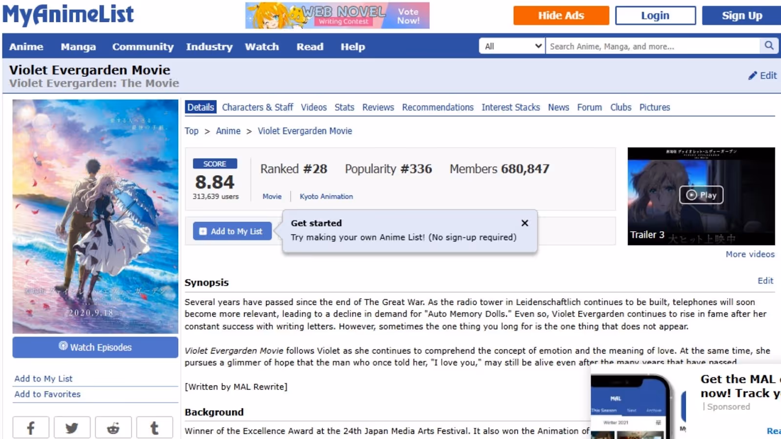出典:my anime listに記載されている『劇場版ヴァイオレット・エヴァーガーデン』