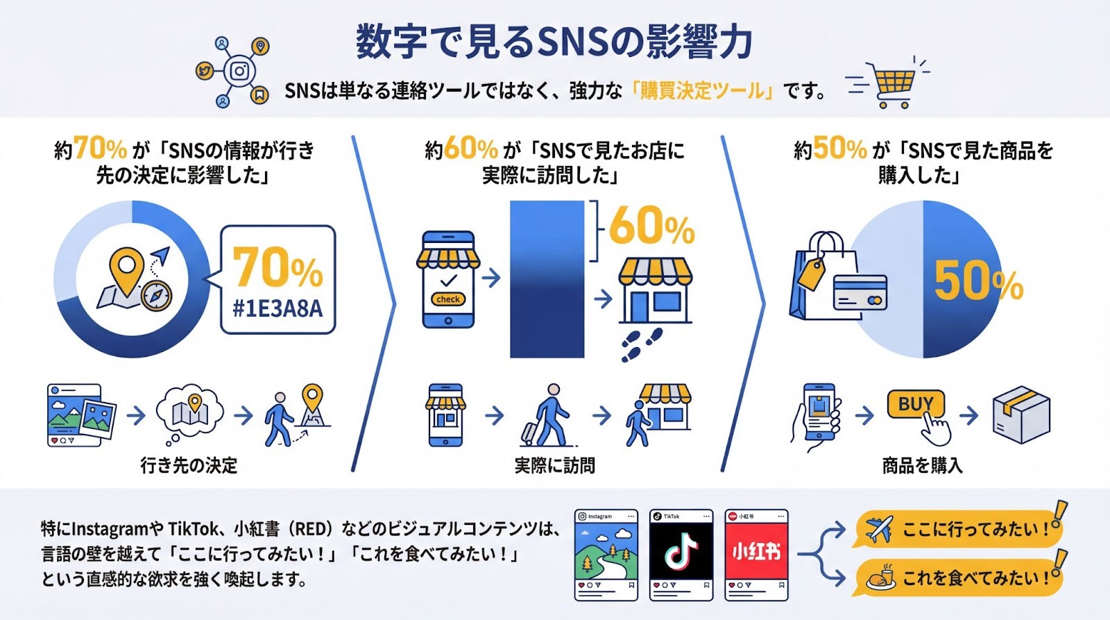 特にInstagramやTikTok、小紅書(RED)などのビジュアルコンテンツは、言語の壁を越えて「ここに行ってみたい!」「これを食べてみたい!」という直感的な欲求を強く喚起します。