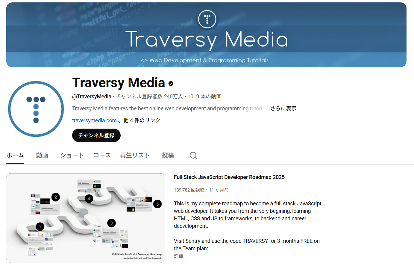 Traversy Mediaは、Web開発を中心としたプログラミング学習系チャンネルです。HTML/CSSやJavaScript、React、Node.jsなどの実践的なチュートリアルが多数公開されています。元フルスタックエンジニアのBrad Traversy氏を中心に運営され、初心者にもわかりやすい丁寧な解説と現場で使えるスキルにフォーカスした構成が特徴です。1時間超のボリュームある動画も多く、実際の開発を追体験しながら学べるため、独学の学習者や副業エンジニアにとっては非常に有益なチャンネルとなっています。開発初心者やプログラミング経験者など、テック人材に刺さる内容の動画がラインナップされているのが魅力です。