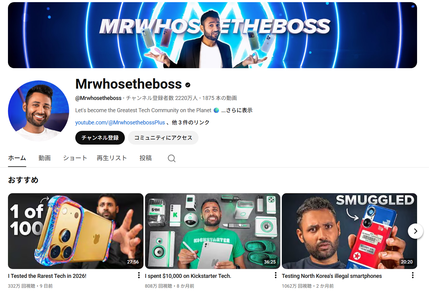Mrwhosethebossは、イギリス出身のArun Maini氏が運営する、テックレビュー系チャンネルです。このチャンネルは、アメリカを含む英語圏で非常に高い人気を誇ります。動画の内容はスマートフォンやノートパソコン、ウェアラブルデバイスの比較レビューが中心で、特に「ベスト〇〇」形式のまとめ動画は視聴者からの信頼が厚いです。視覚的に洗練された映像とわかりやすい構成、正直なレビューが多くの視聴者の購買行動に影響を与えています。特定のメーカーに偏らず、幅広い製品を取り上げる姿勢も好評で、コンテンツの説得力が非常に高いチャンネルです。