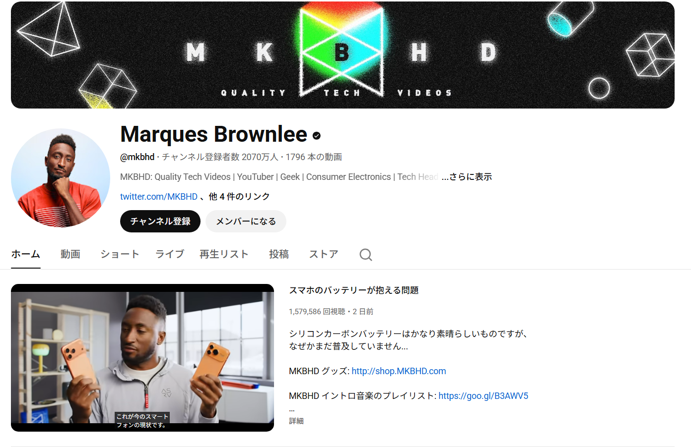 Marques Brownlee氏が運営するチャンネル通称「MKBHD」は、ハイクオリティなガジェットレビューで知られるチャンネルです。登録者数からわかるように、かなりの影響力を持ち、テック分野のYouTuberにおいてトップクラスと言っても過言ではないでしょう。スマートフォン、タブレット、EV(電気自動車)などの製品レビューに加え、業界著名人とのインタビュー企画も展開し、テクノロジーの最前線を網羅しています。彼のレビューは、映像の美しさと分析力の高さが際立っており、製品の魅力と弱点を的確に伝えるバランス感覚に優れているのが特徴です。また、編集技術のレベルも高く、情報の正確性とわかりやすさの両面で高評価を受けています。