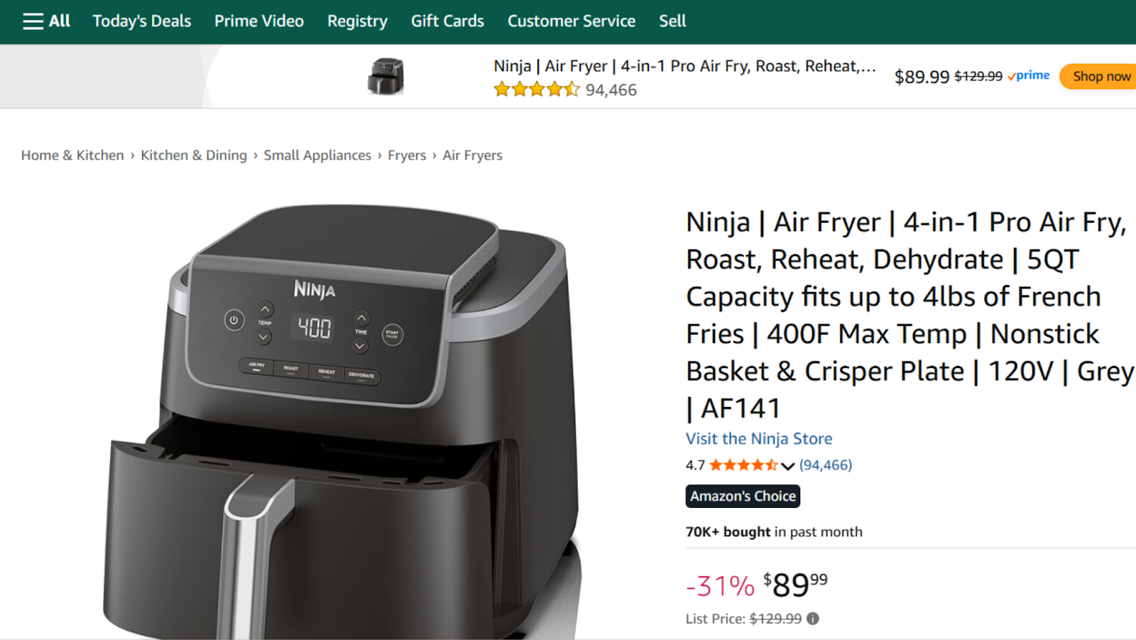 出典:Ninja Air Fryer AF141(4-in-1)のアマゾン商品ページ