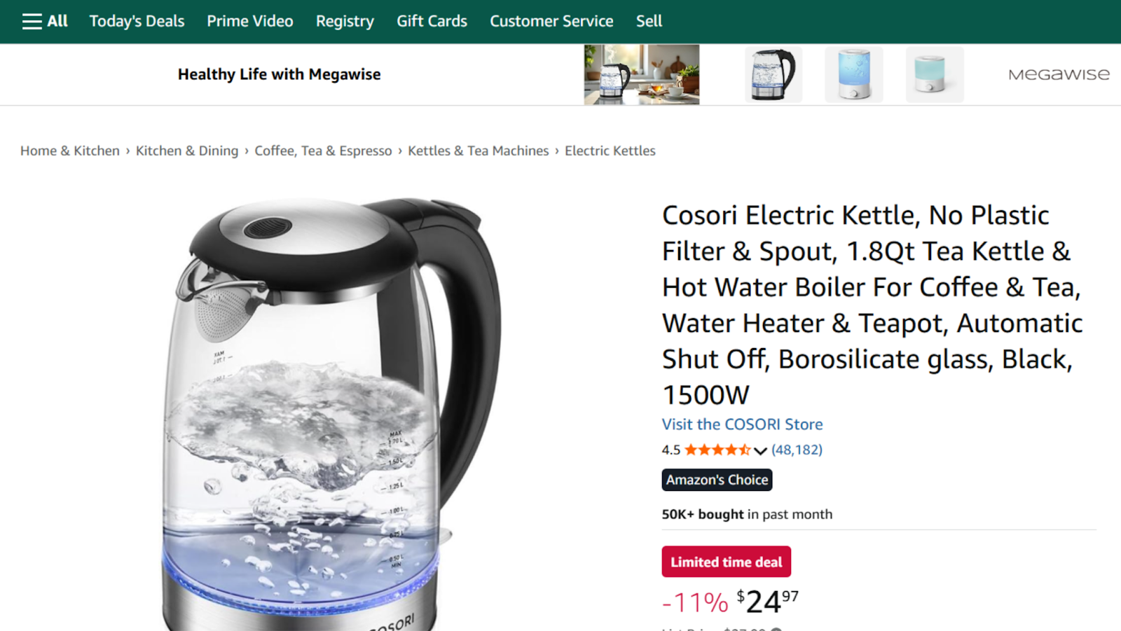 出典:Cosori 電気ケトル(1.8Qt)のアマゾン商品ページ