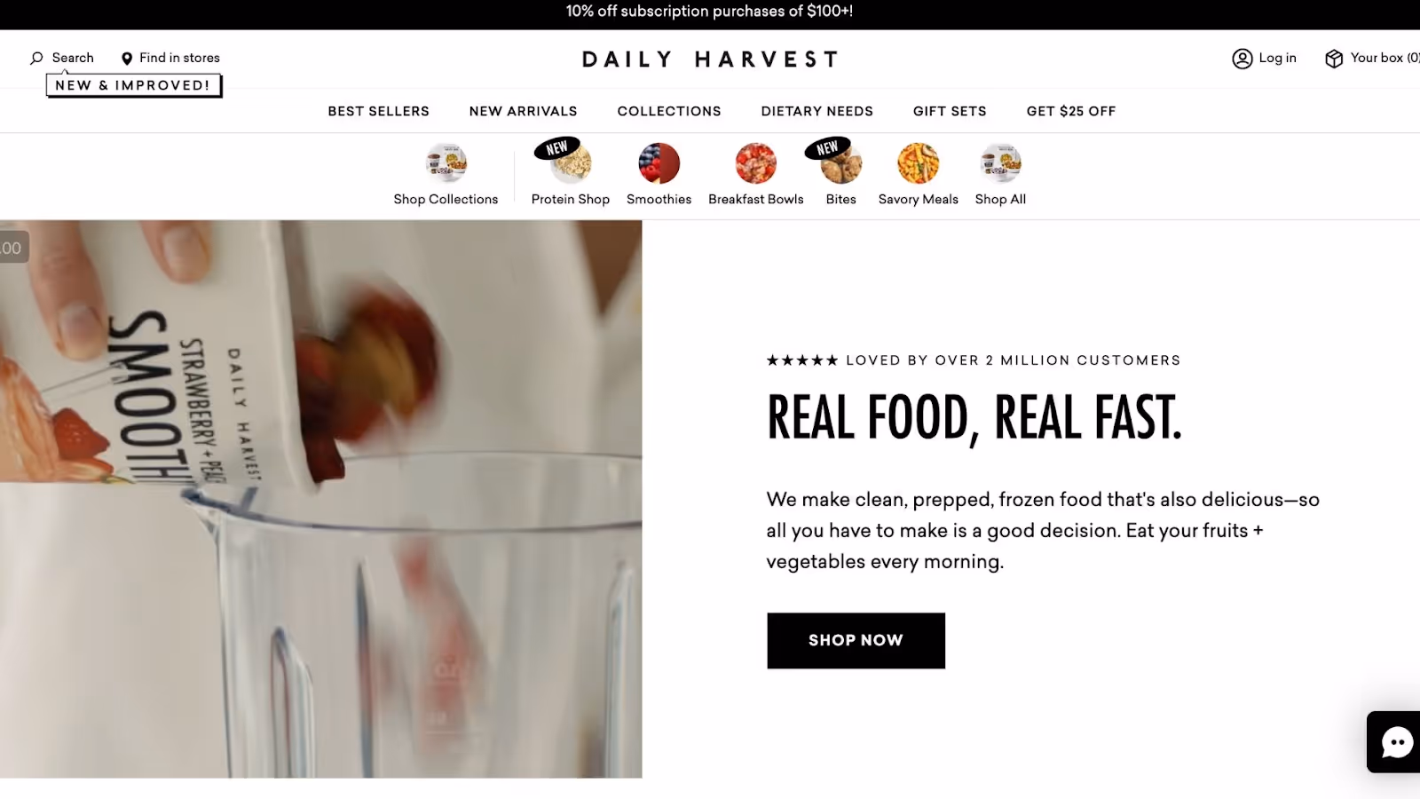 Daily Harvestは、冷凍スムージーやボウル、スープなどを自宅に届けるサービスで、すべて植物性かつ95%以上がオーガニックという高品質が特徴です。調理済みまたはそのまま食べられる商品が中心で、冷凍からすぐに取り出してレンジやミキサーで簡単に調理できるため、忙しい人や料理が苦手な人にも好まれています。保存期間が長く、無駄なく使える点も評価されています。健康志向でナチュラルな食生活を目指す人に特におすすめのサブスクです。