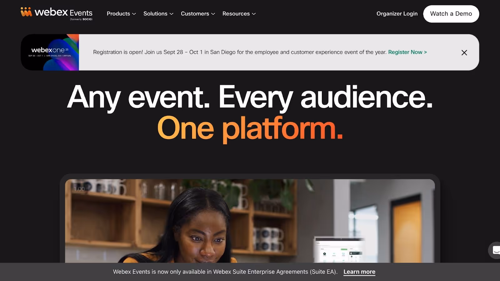 Cisco傘下のWebexが提供する「Webex Events(旧Socio)」は、大規模イベントや企業向けカンファレンスに特化したプロフェッショナル向けプラットフォームです。セキュリティと安定性に優れ、Fortune500企業を中心に多くの導入実績があります。注目されているのは、イベント中の参加者データの追跡と分析機能。
