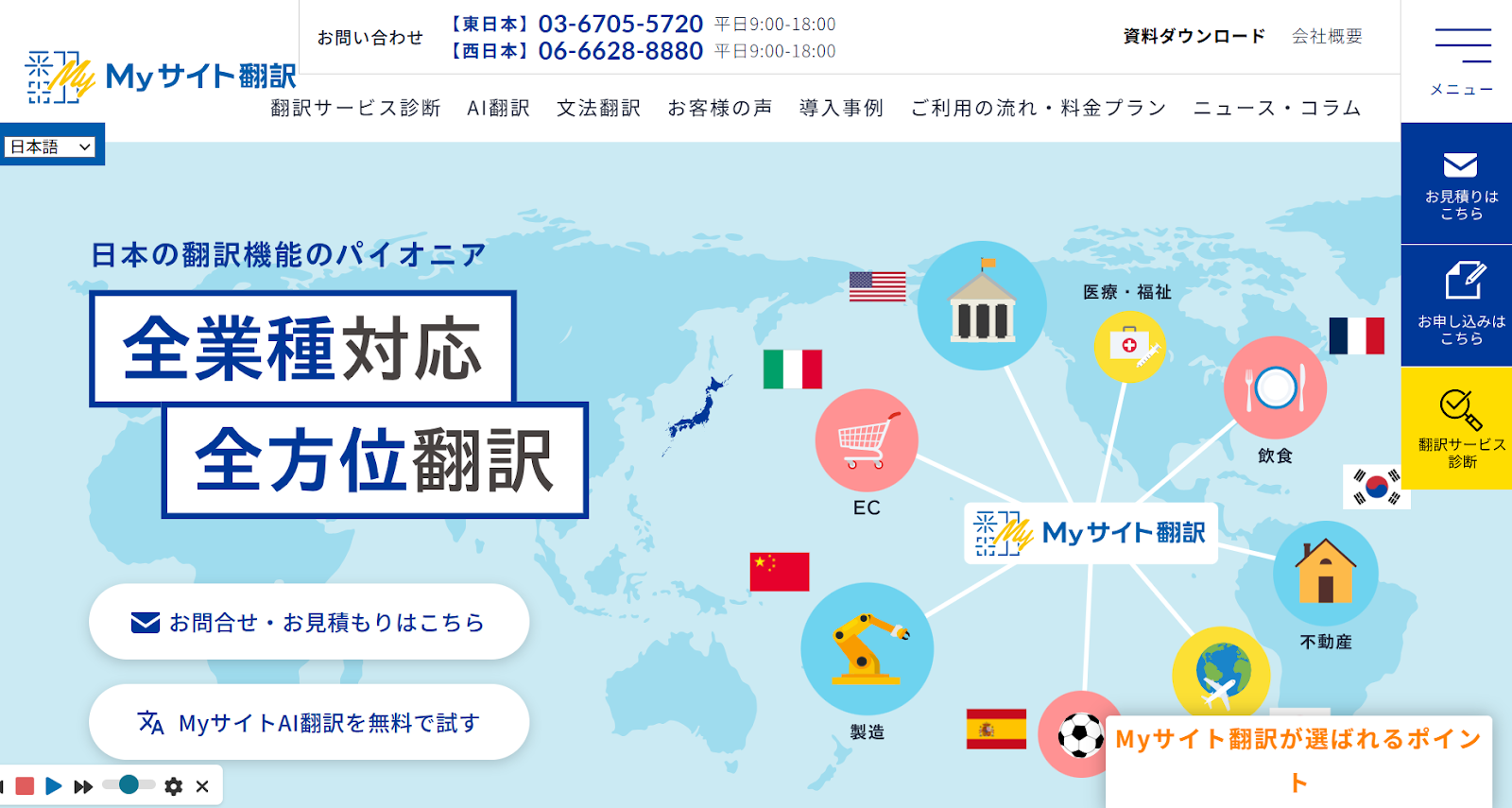「MYサイト翻訳」は、日本語処理技術に強みを持つ「株式会社高電社」が提供するWebサイト翻訳ツールです。「AI翻訳」と「文法翻訳」の2種類の翻訳を駆使し、あらゆる業種・業界に対応しています。BtoB向けのサービスサイトと特に相性が良い点が特徴です。